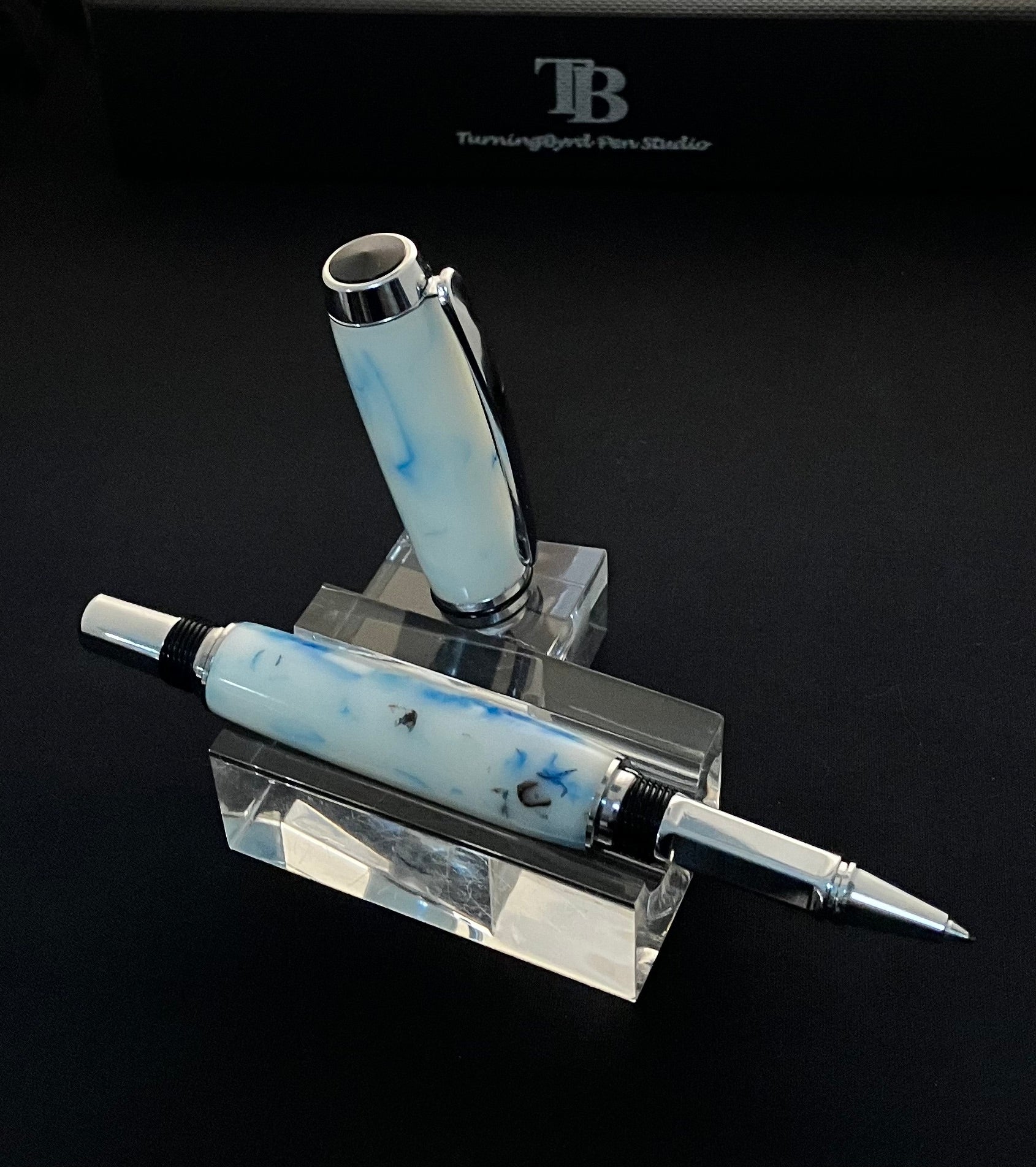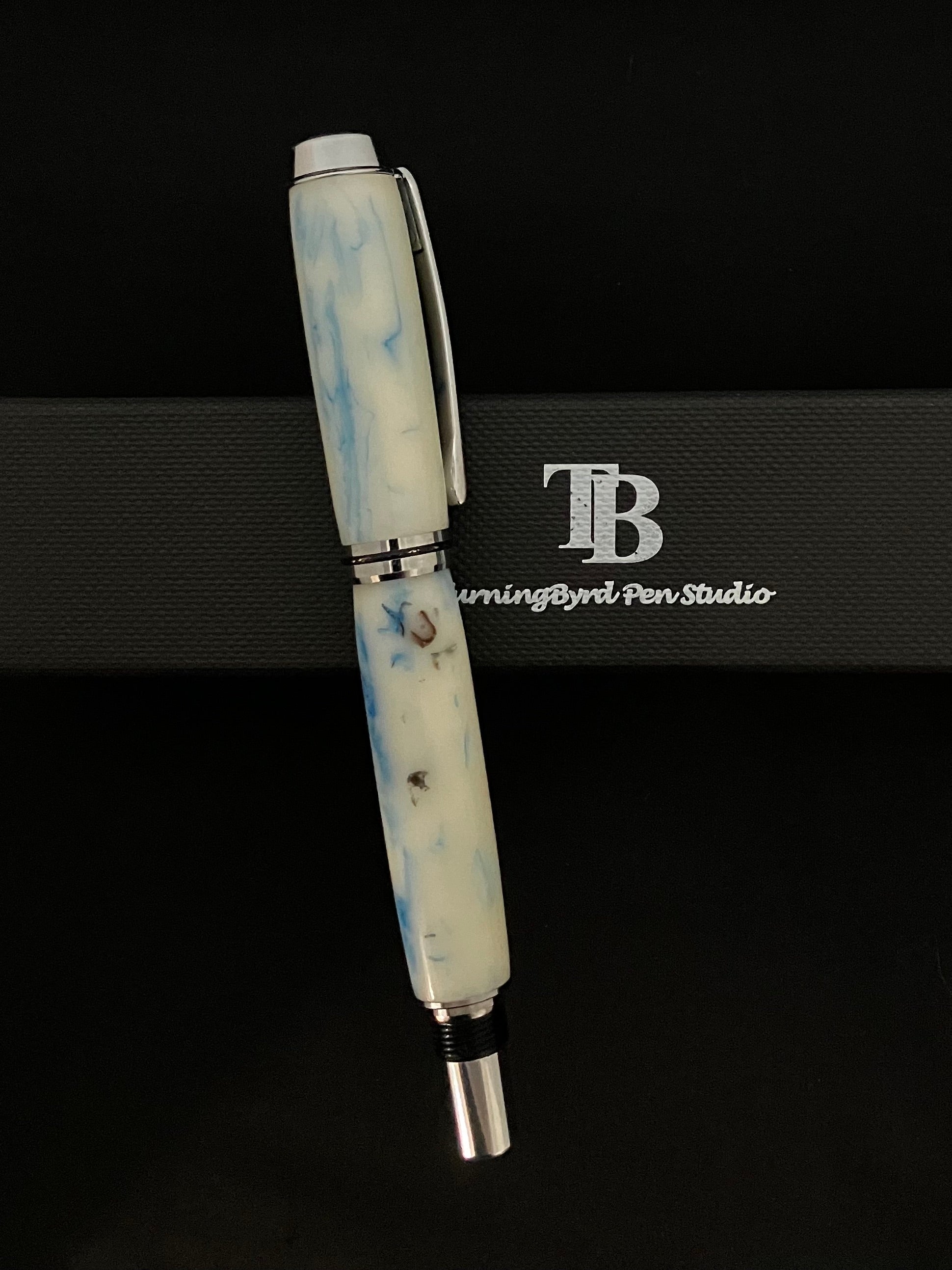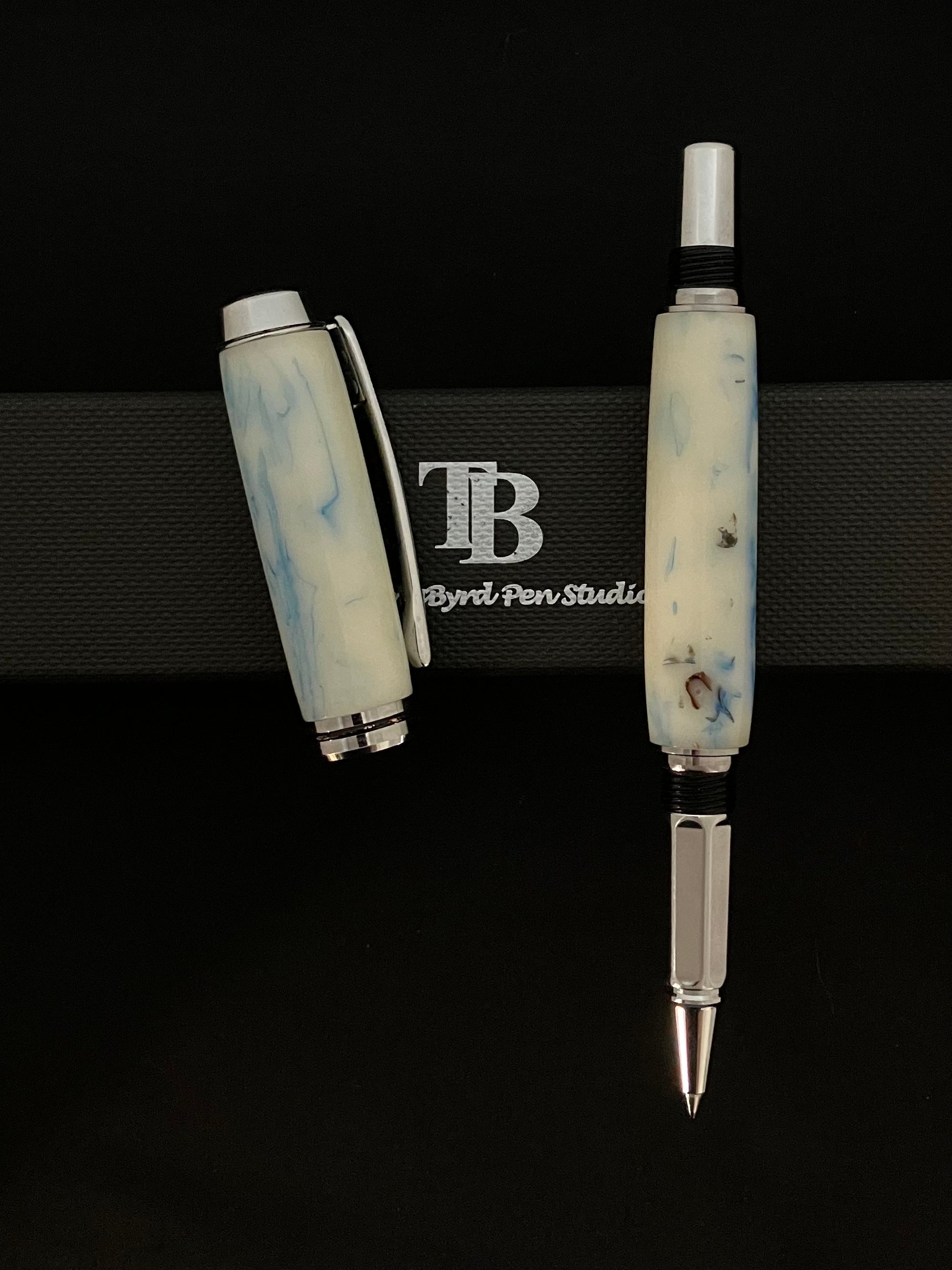 This handcrafted Rollerball pen is made with a custom white resin with light blue swirls and bits of sea shells with black accents for that really unique look! The chrome plating is extremely durable and beautiful. It features a custom spring pocket clip with a chrome tapered finial with black inlay. All of this fine detail is complimented by the single thin black line of the center ring, to give a warm, rich look of elegance. This is a beautiful, well balanced and comfortable pen to write with and admire.