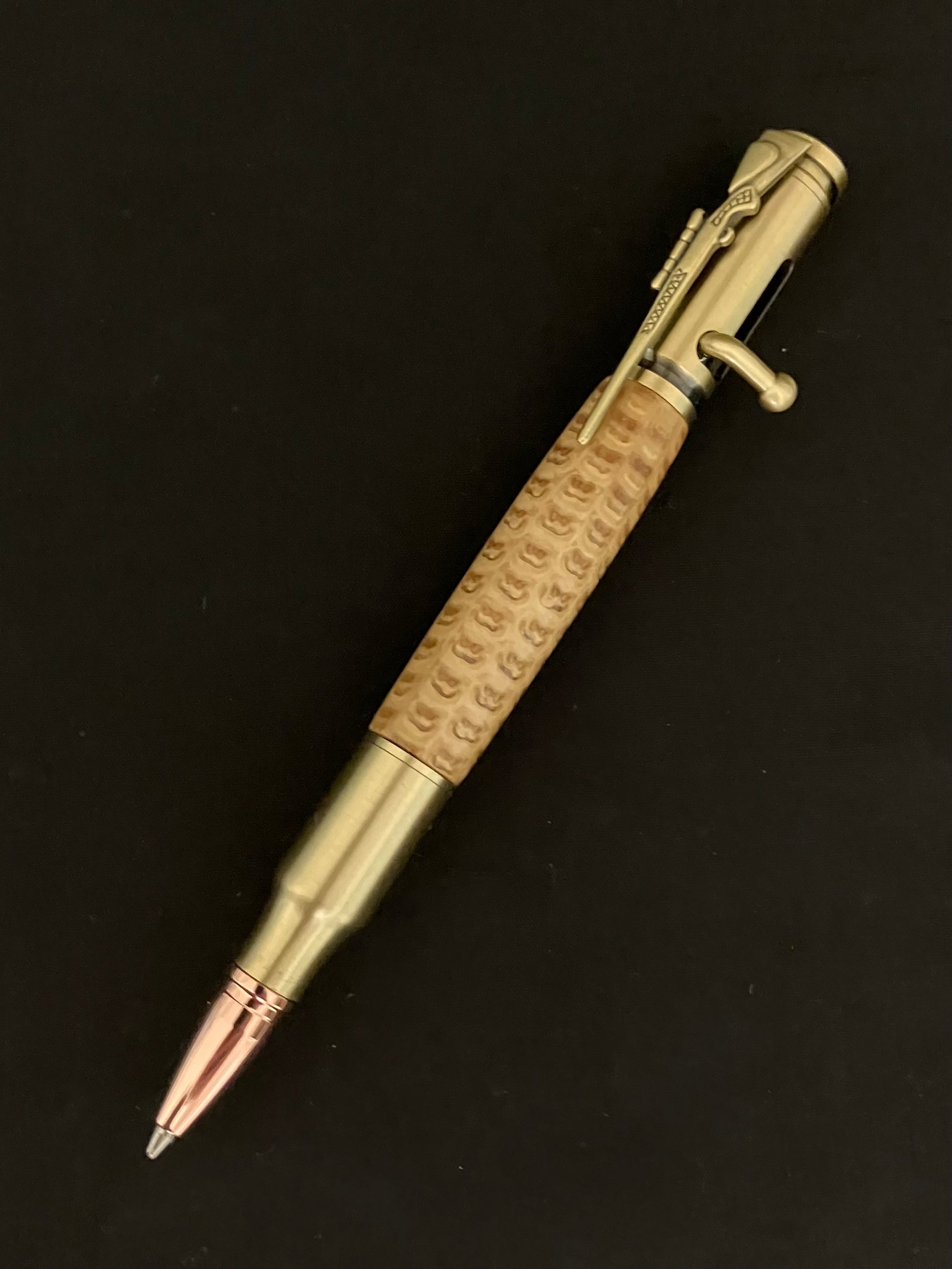 This completely original and irresistibly fun Bolt Action ballpoint pen will be hard for any hunting or target-shooting enthusiast to put down. Every detail, from the one of a kind bolt action mechanism to the precision engineered components, was carefully designed to ensure uniqueness and reliability. The realistic bolt-action handle smoothly advances and retracts to securely lock the refill in place. Includes a bolt action rifle clip and a replica 30 caliber cartridge and rose gold bullet tip for added authenticity.
