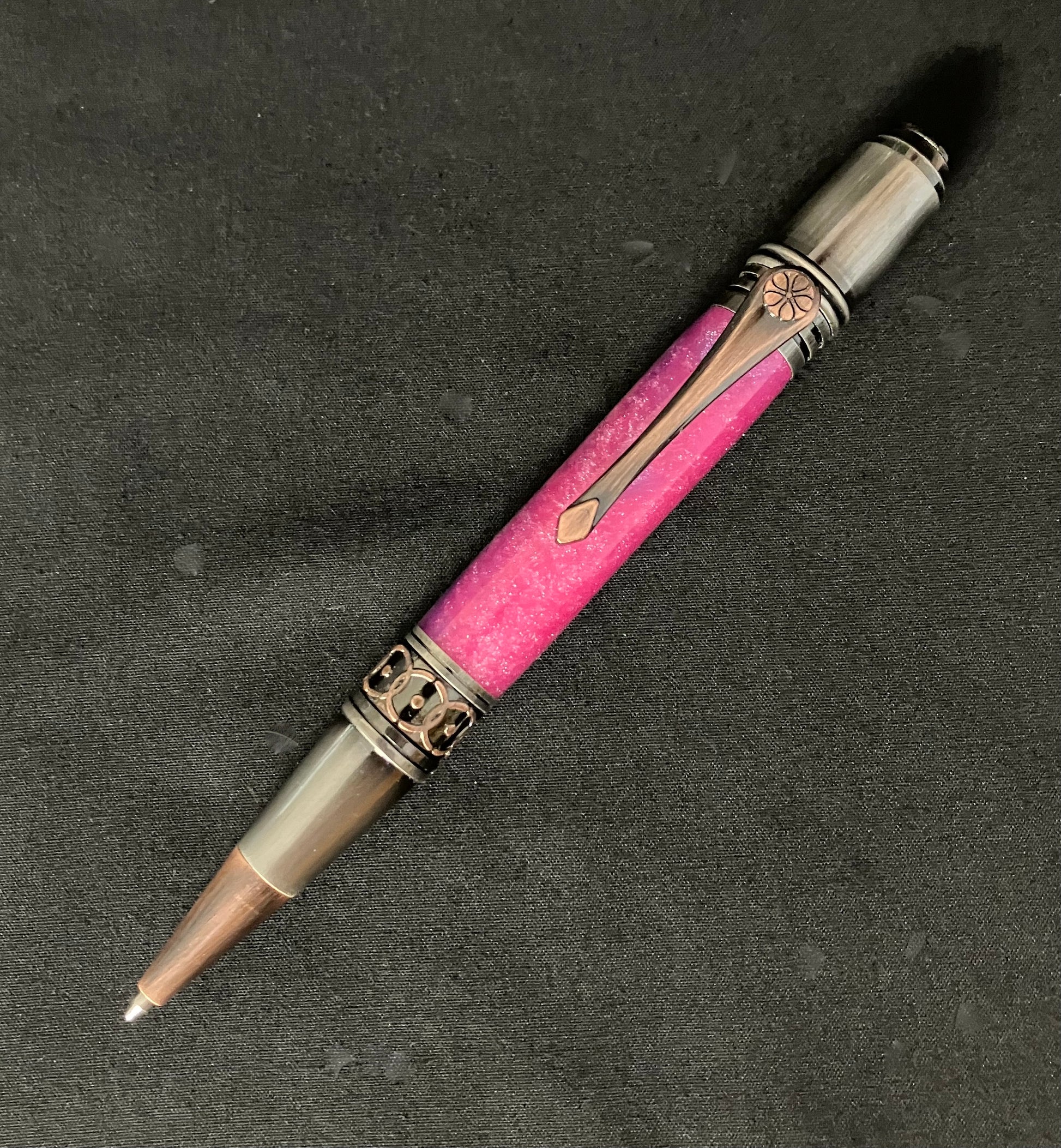 The pen body is a beautiful rose fusion sparkle! You can see it twinkle and when the light hits it the sparkle begins! A top twist pen with antique rose copper accents!