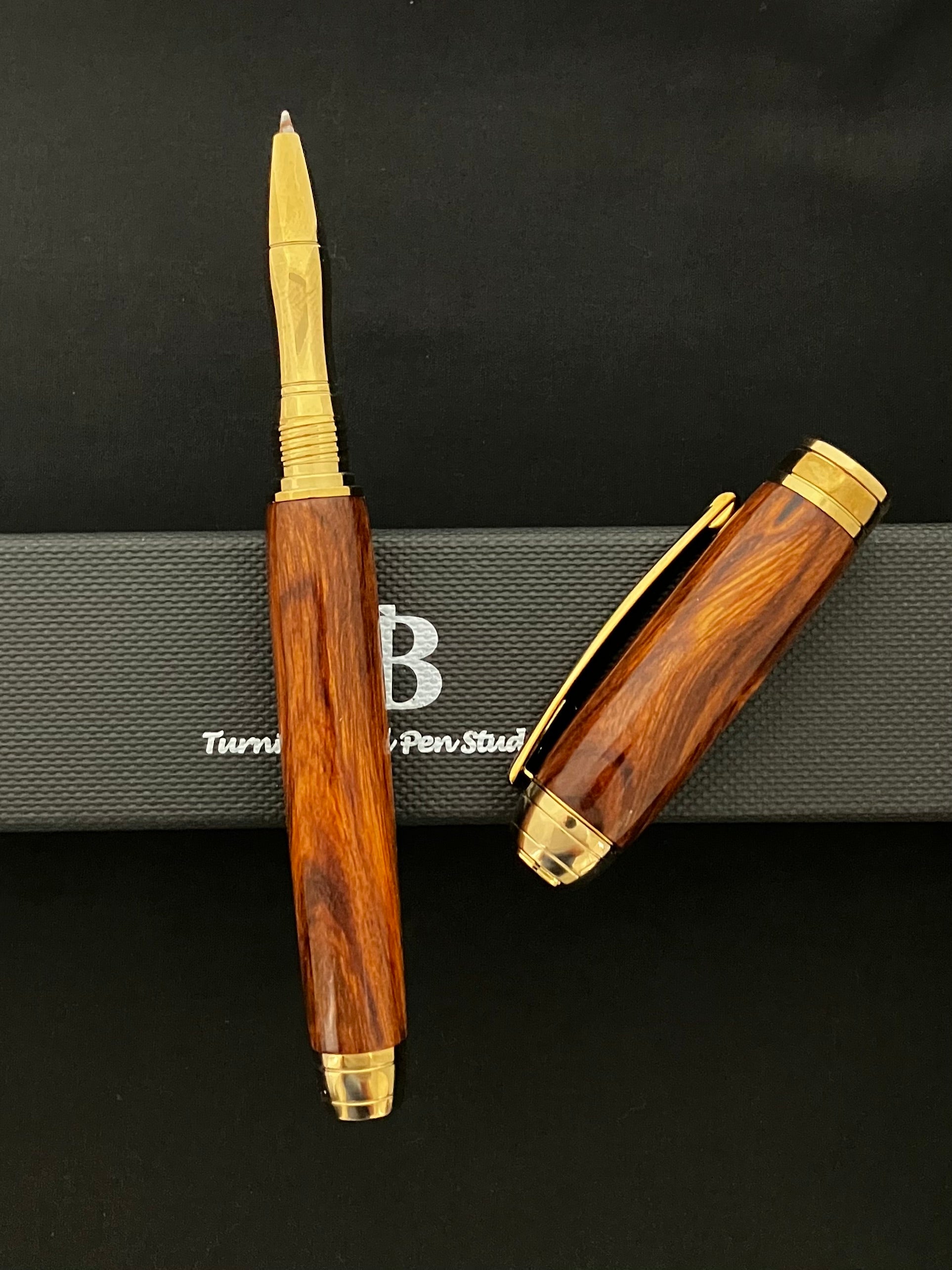 If you are looking for that very unique, one of a kind handcrafted rollerball pen - this is it! A very unique pen - a highly figured pen from South American Cocobolo matched with gold plating -Truly a one of a kind pen! This non-postable pen is beautifully balanced and equipped with an extremely smooth writing Schmidt ceramic tipped refill.
