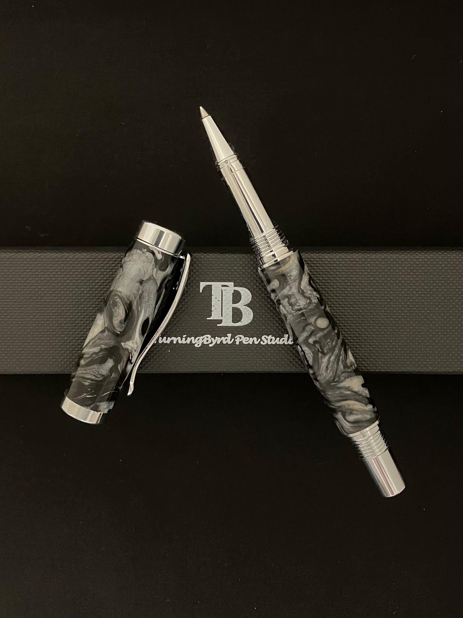 Beautiful black and silver with a hint of gold resin creates a beautiful rollerball pen and is matched, for a distinguished look, with extremely durable chrome plating.