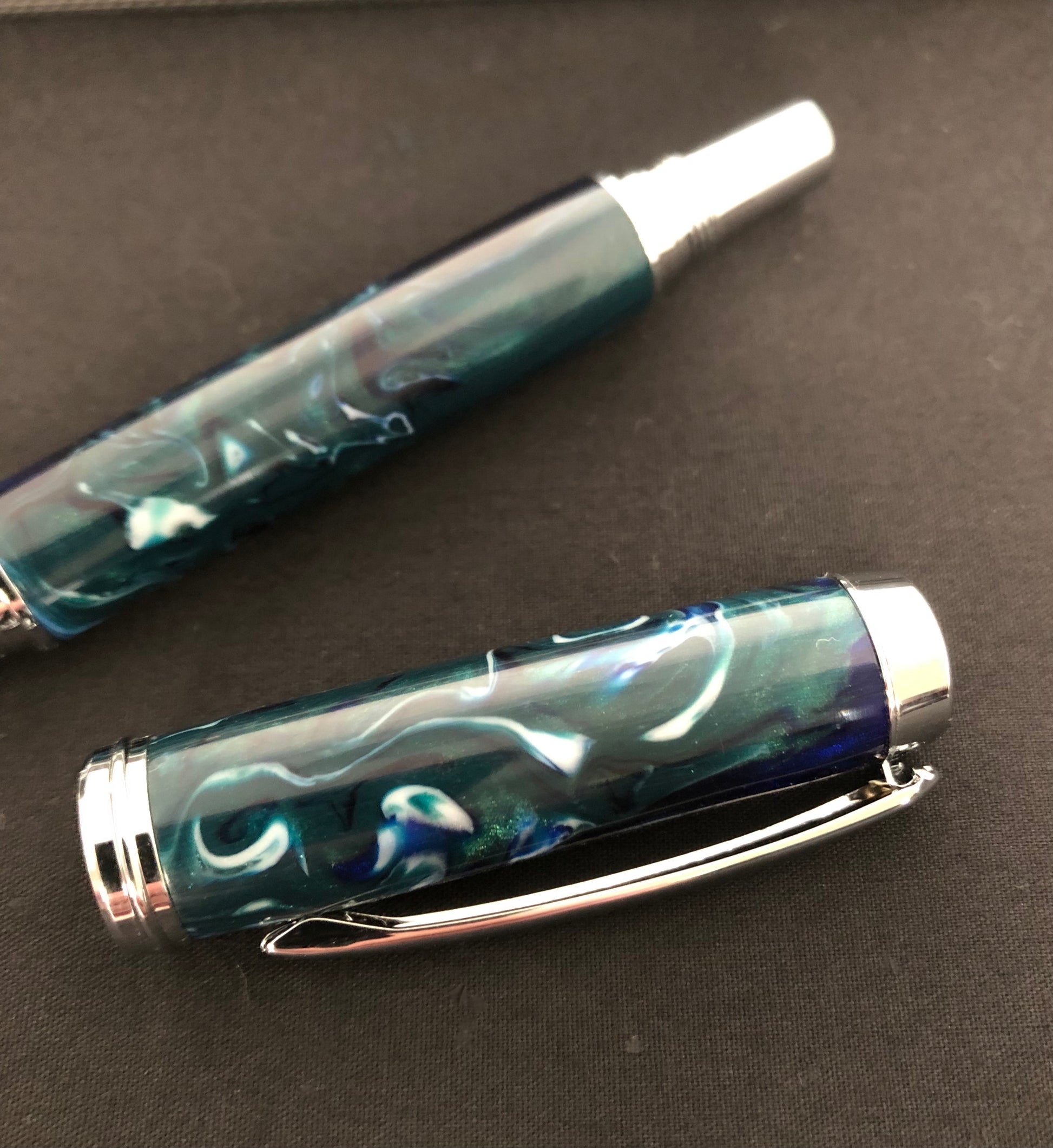 The body of this pen is made with "Deep Blue Currents" Resin! Looking at the pen you can see deep shiny blue currents running through the sparkling green and white flecks! This pen is very comfortable to write with, has a classic feel, is well balanced and the cap is postable! It is beautifully matched with Chrome and Chrome accents! There is an awesome glitter that reminds me of crystals in the light - sparkling and dazzling to look at and certain to get admiring glances!