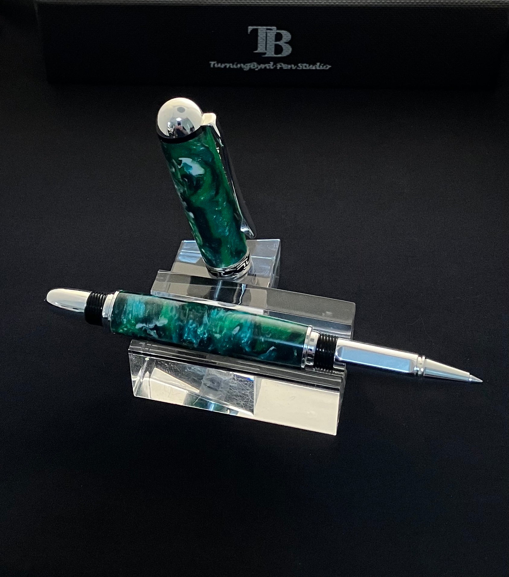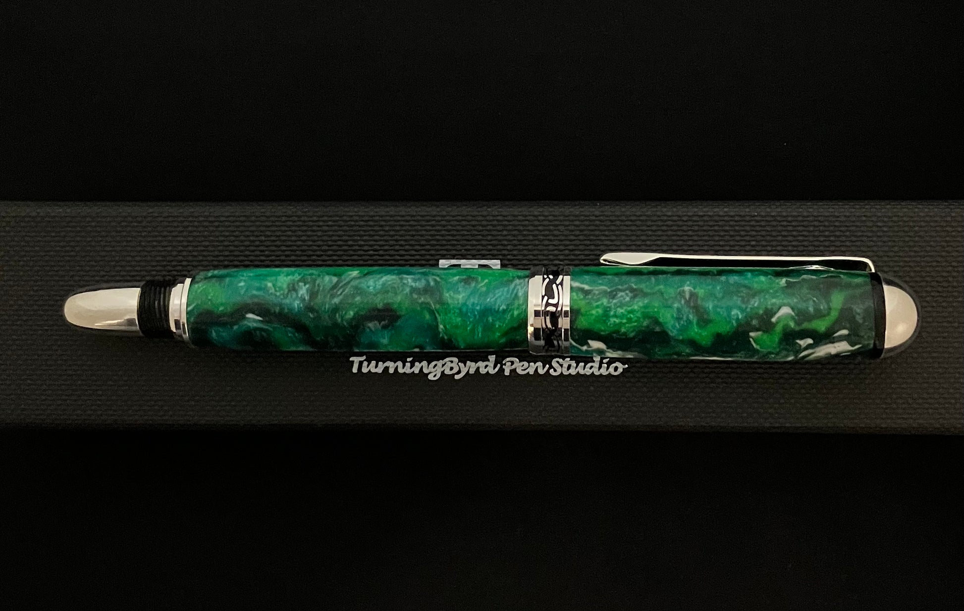 The body of this pen is made with sparkling green and shades of black and white creating a swirl I call Green Turbulence! it all seems to come alive as you turn the pen and watch the light reflecting! This pen is very comfortable to write with, has a classic feel, is well balanced and the cap is postable!