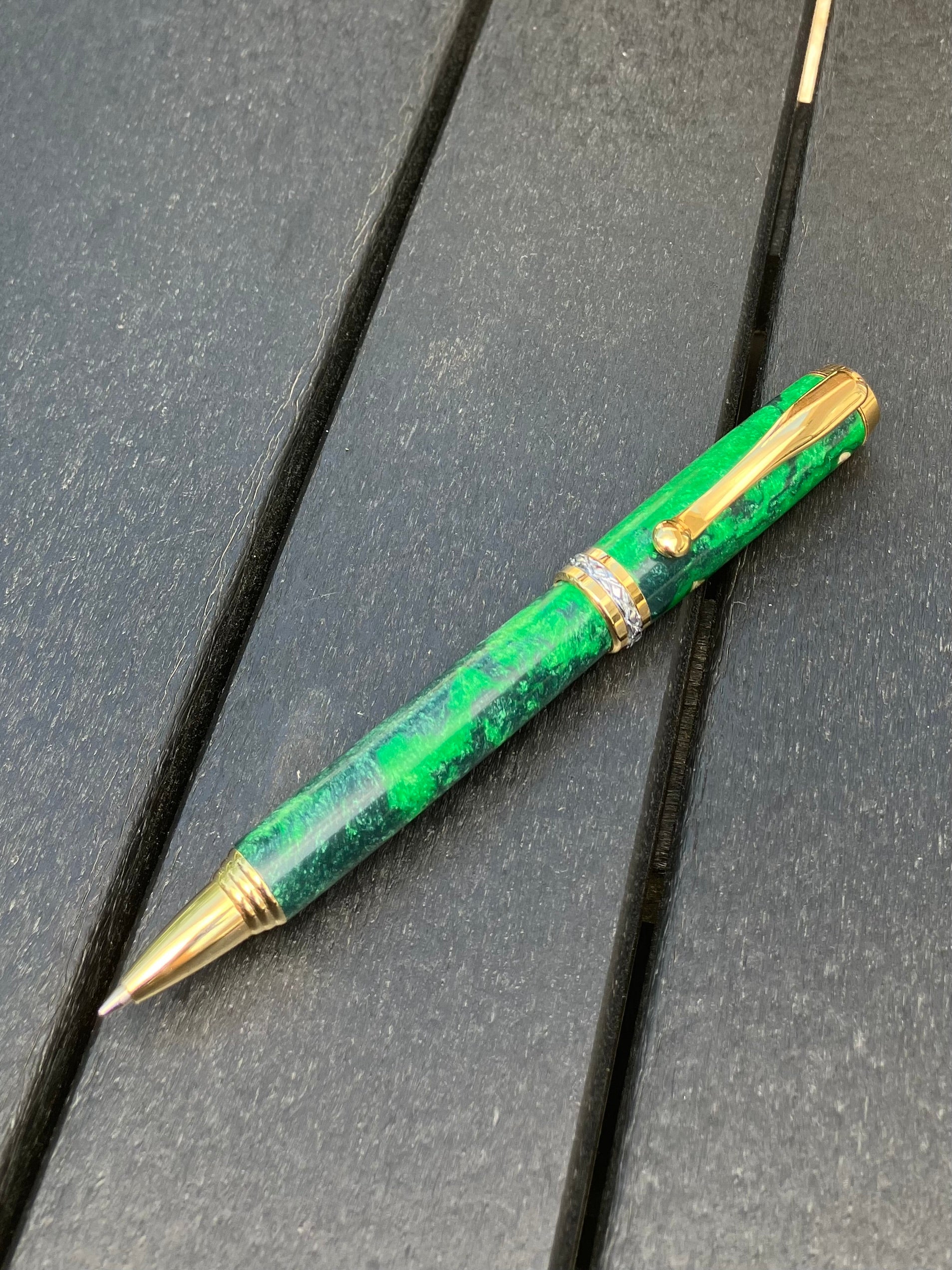 If you are looking for that very unique, one of a kind handcrafted Ballpoint Pen - this is it! This great shades of green with lots of sparkle will provide outstanding writing pleasure with that classic, executive, look and feel. Several shades of green and a touch of gold along with bits of sea shells are mixed and cast to create this one of a kind pen!