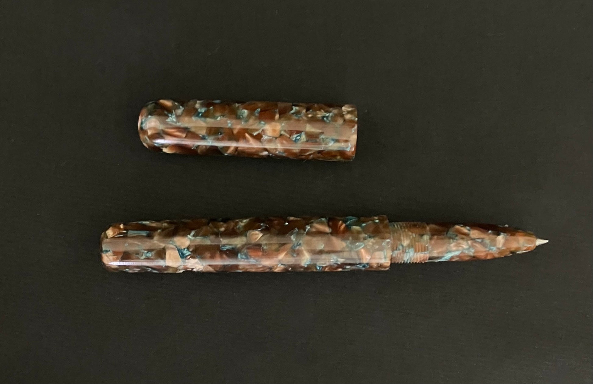 Totally custom Italian Resin Rollerball pen. The only commercially manufactured part is the refill. Beautiful Italian Resin, well balanced and very comfortable to write with. Beautiful base color of brown with flecks of blue and various shades of browns and bronze! Hard to describe the fantastic look of the resin!