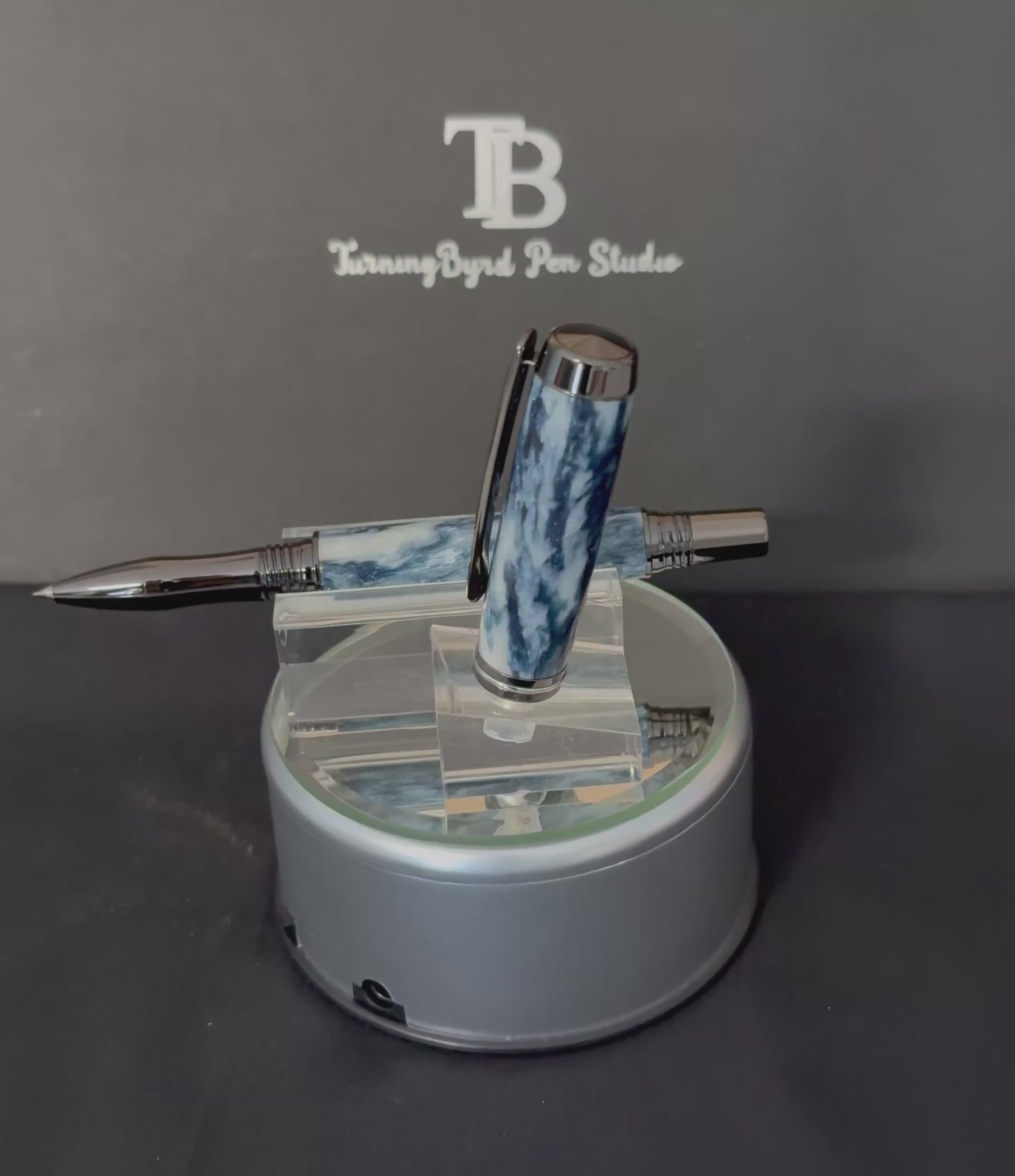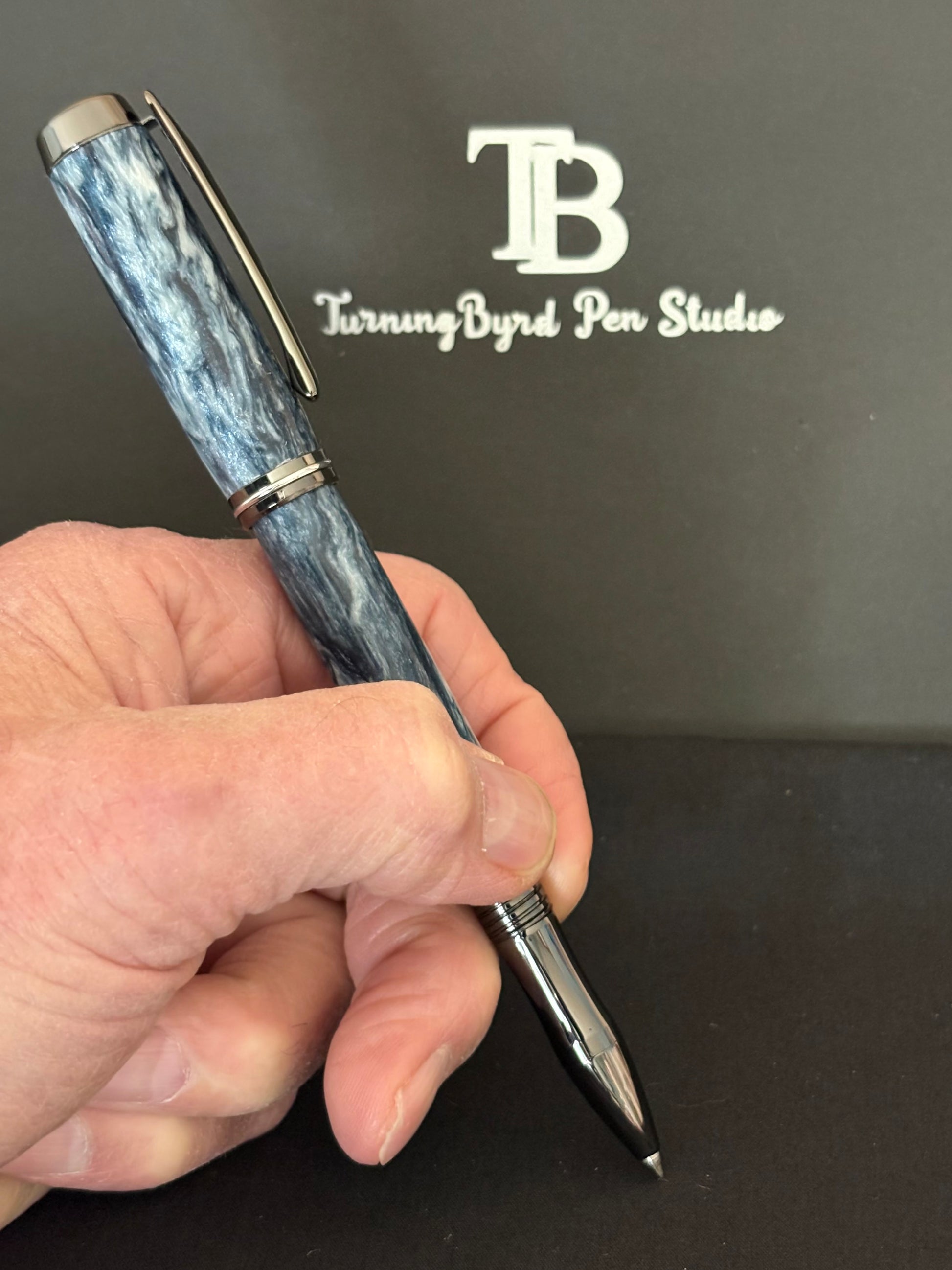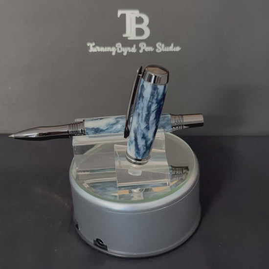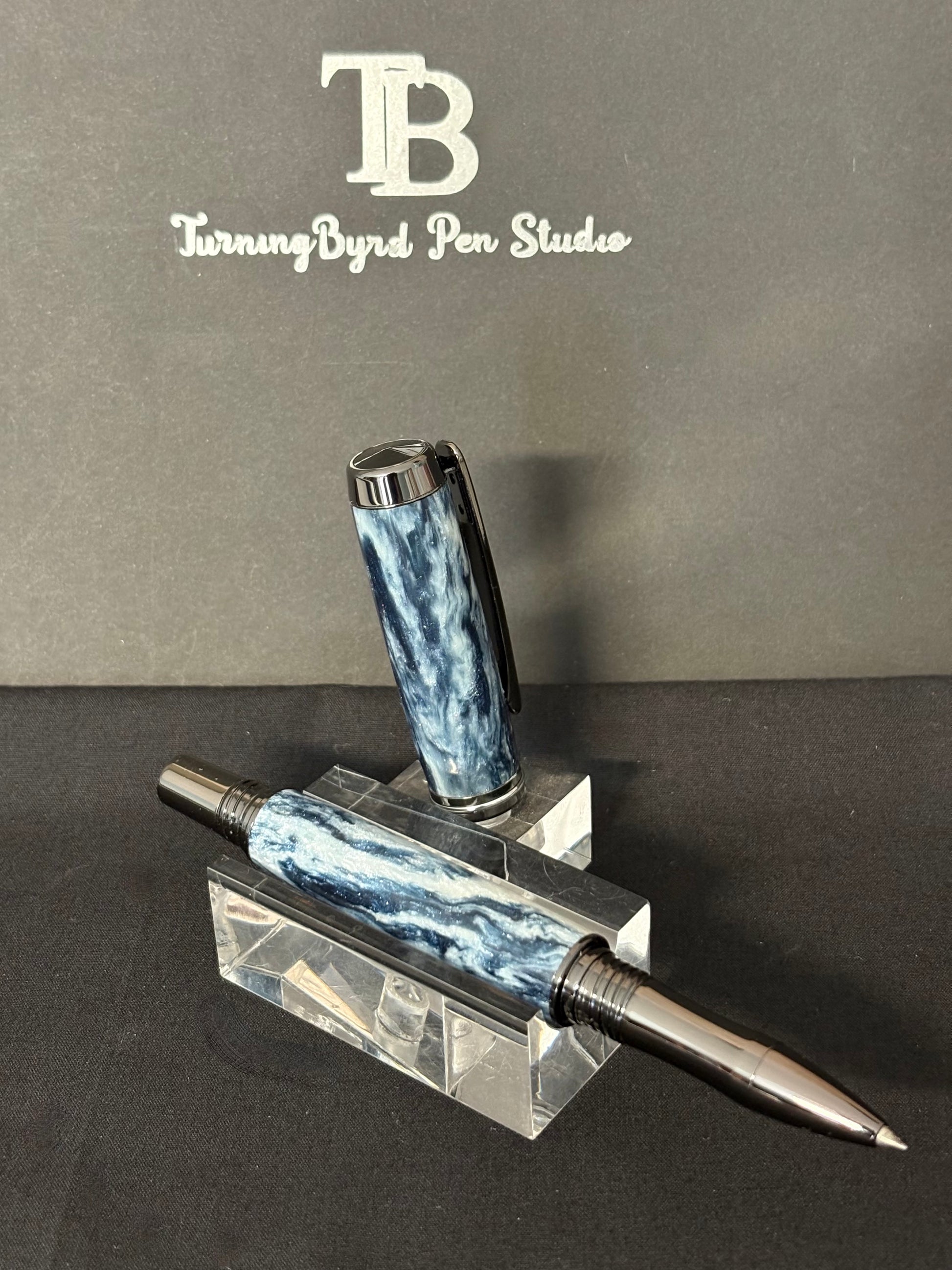 Midnight Skies captures the quiet drama of a night sky just before dawn. Handcrafted from DiamondCast resin, the body shimmers with deep blues layered with soft whites and flashes of silver, creating a flowing, almost celestial pattern that shifts beautifully in the light. No two are ever exactly alike — each pen tells its own story.