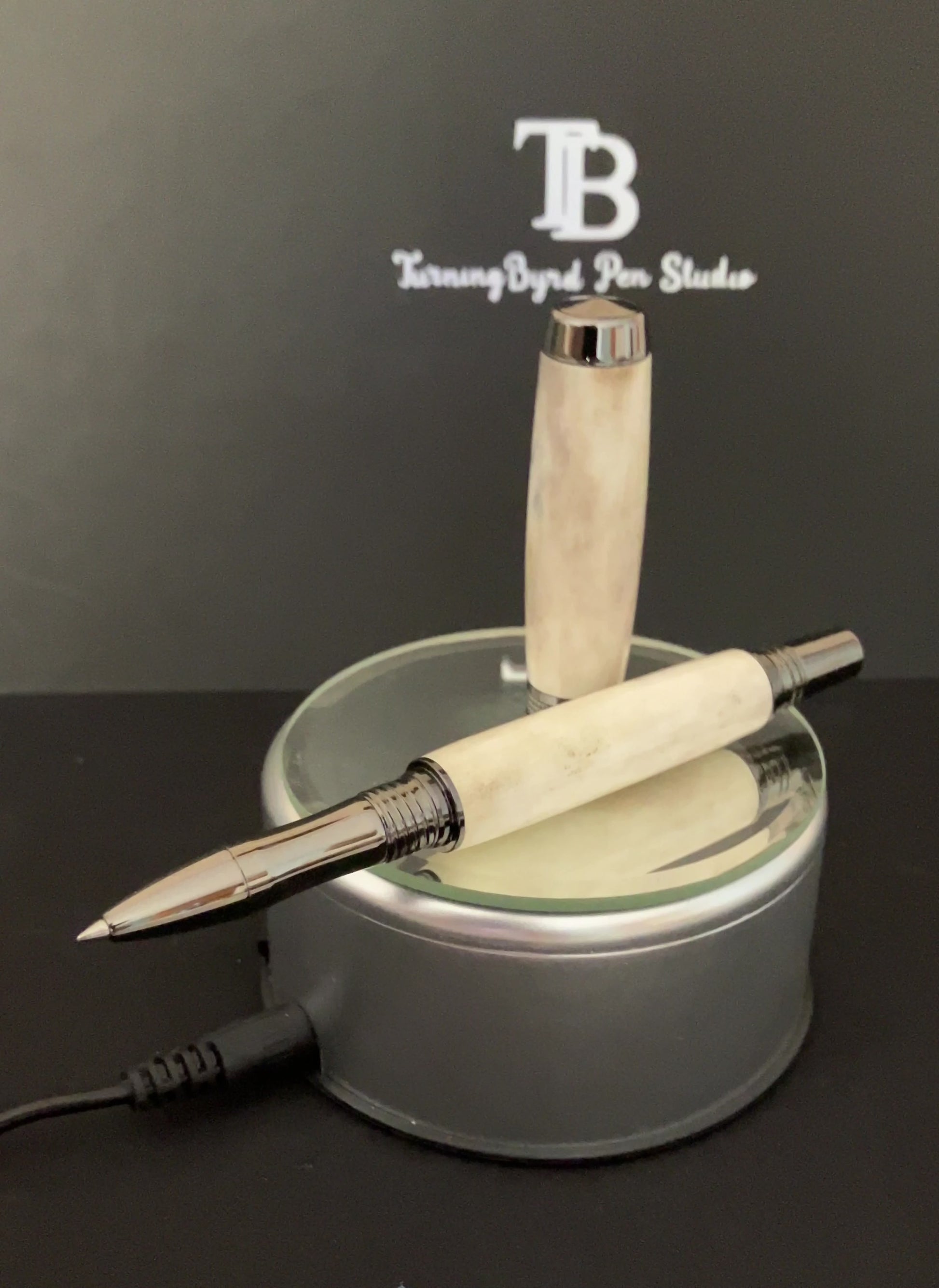 The Whitetail Antler sheds are collected in the woods each winter. The antler is naturally dried and processed to make a pen and then finished with a special, very durable high gloss finish.