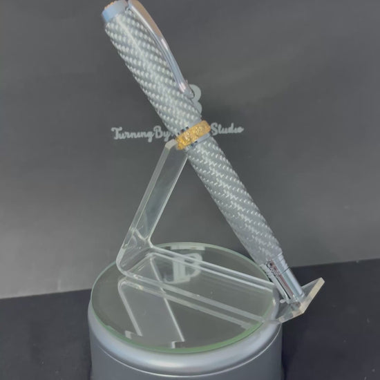 A rollerball pen that's equal parts high-tech sophistication and timeless artistry, hand-turned right here in the studio from shimmering silver carbon fiber, woven tight like a suit of modern armor and cast in crystal-clear resin for that unbreakable gleam and subtle depth that shifts with every angle.