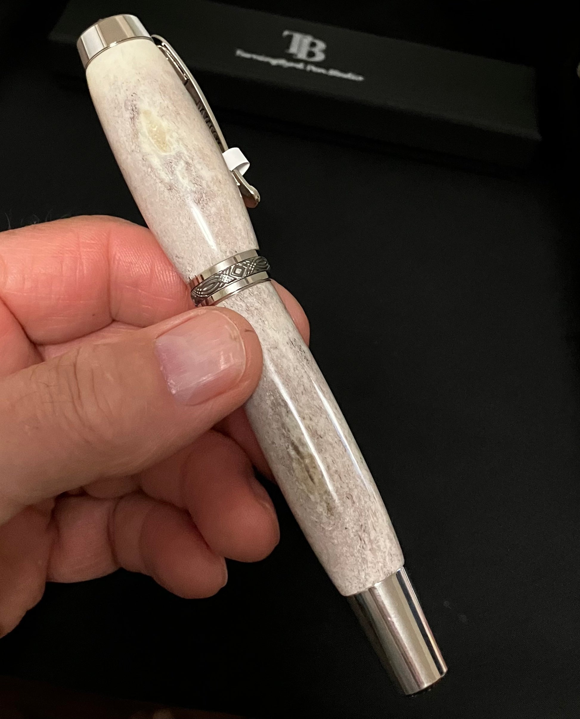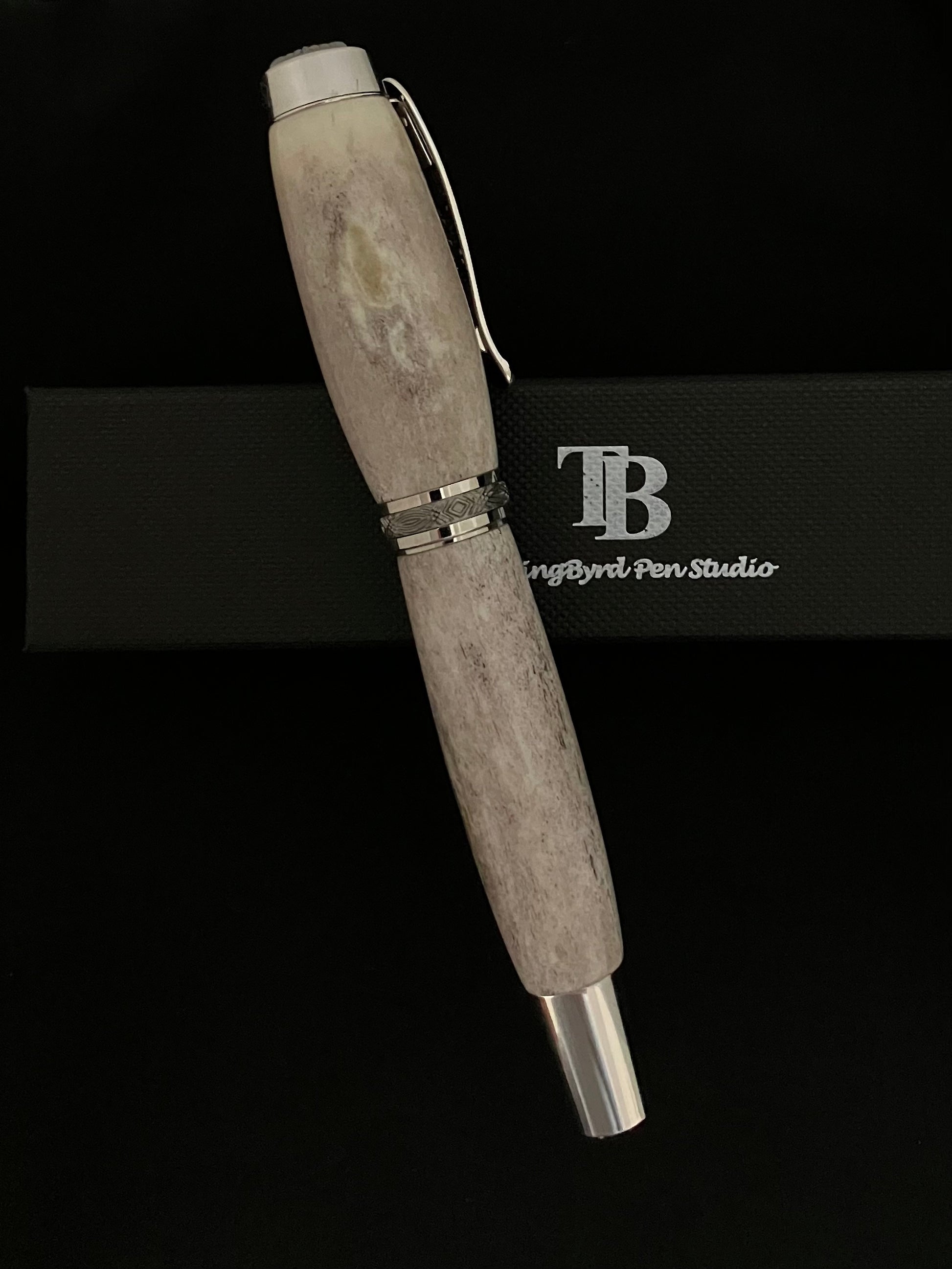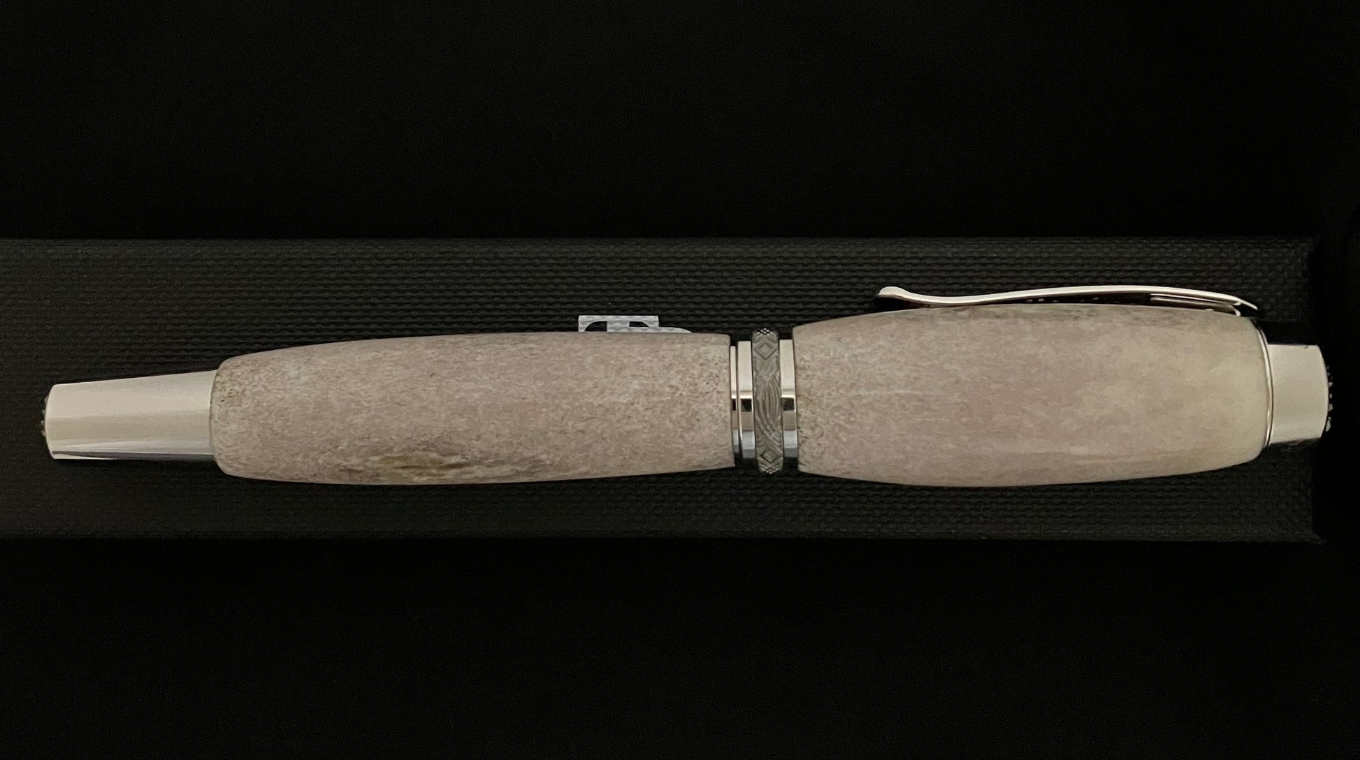 The Whitetail Antler sheds are collected in the woods each winter. The antler is naturally dried and processed to make a pen and then finished with a special, very durable high gloss finish.