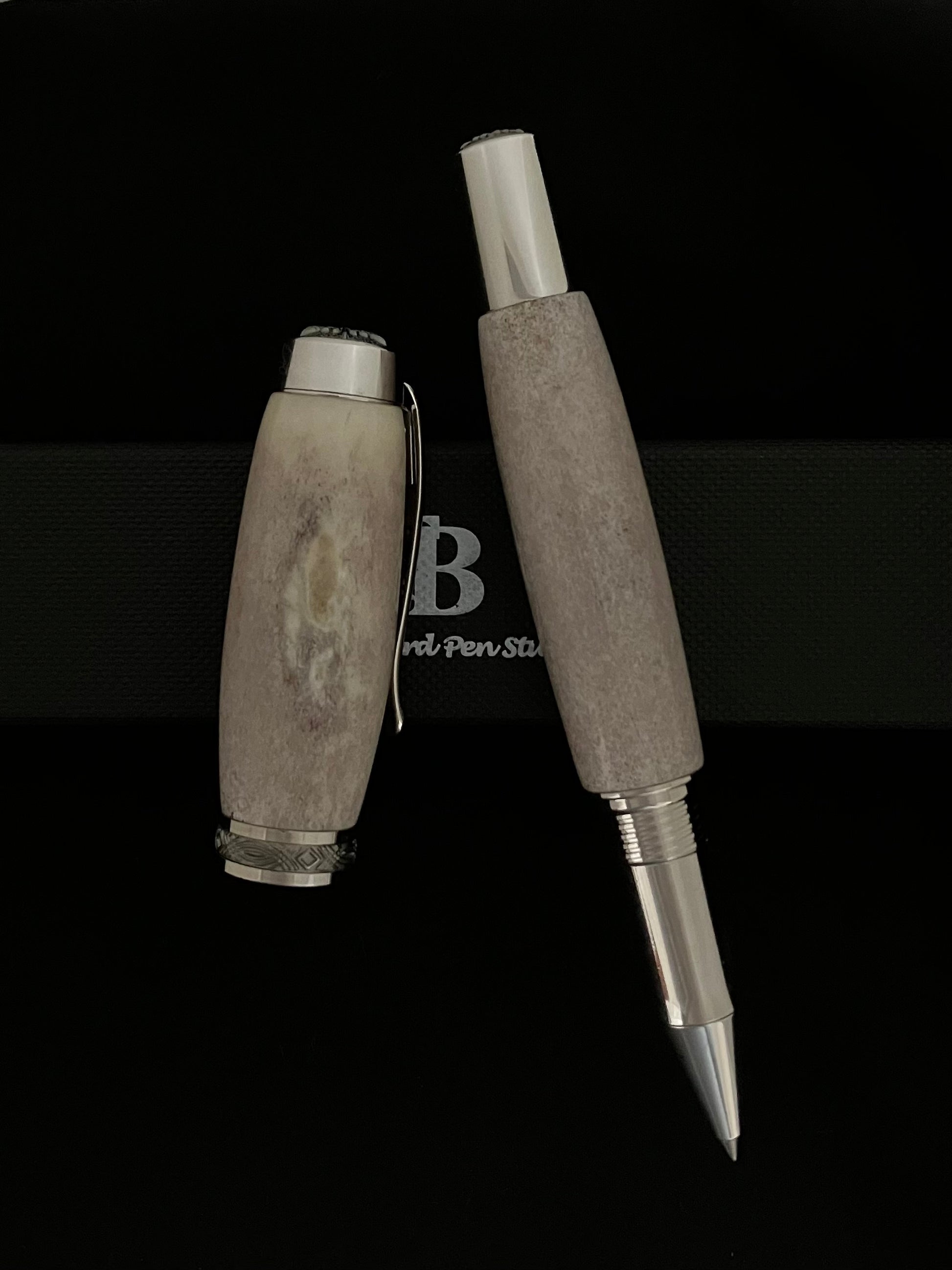 If you are looking for that very unique, one of a kind handcrafted rollerball - this is it! This great rollerball with Whitetail Antler will provide outstanding writing pleasure with that unique one of a kind, look and feel. The components are Rhodium with Black Titanium accents and comes with a Schmidt ceramic tipped rollerball refill.